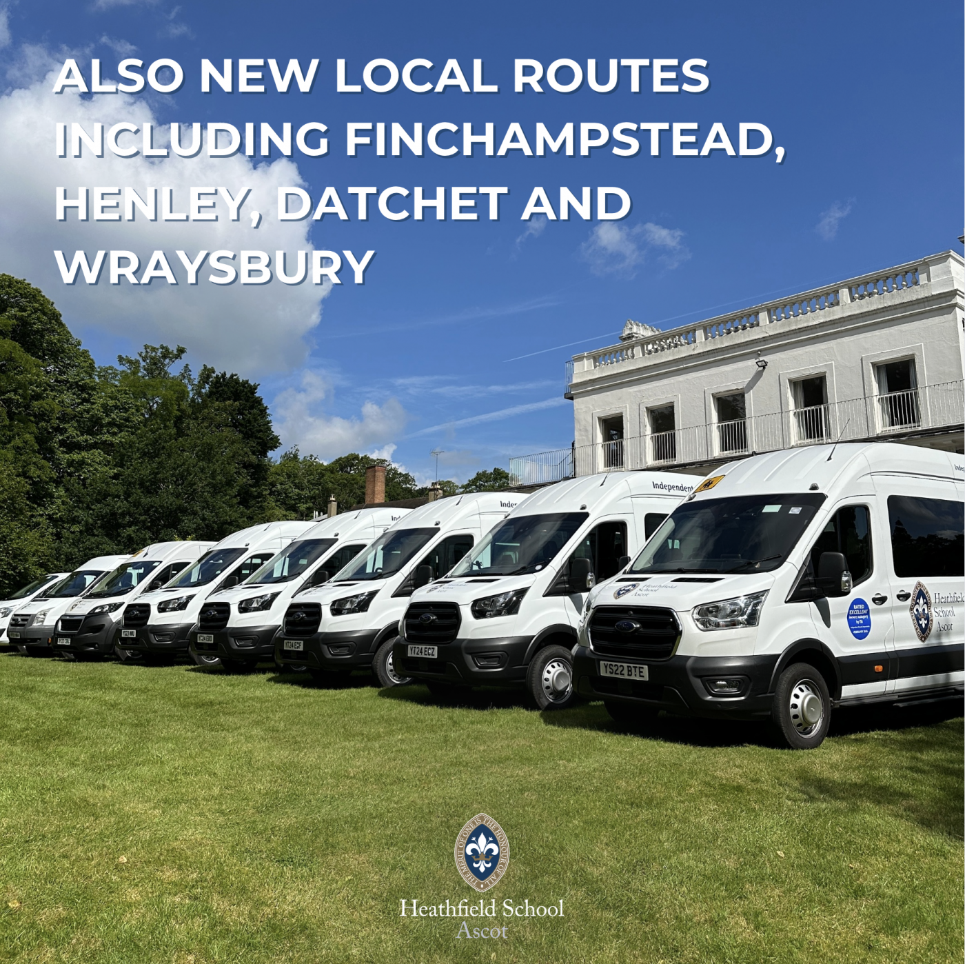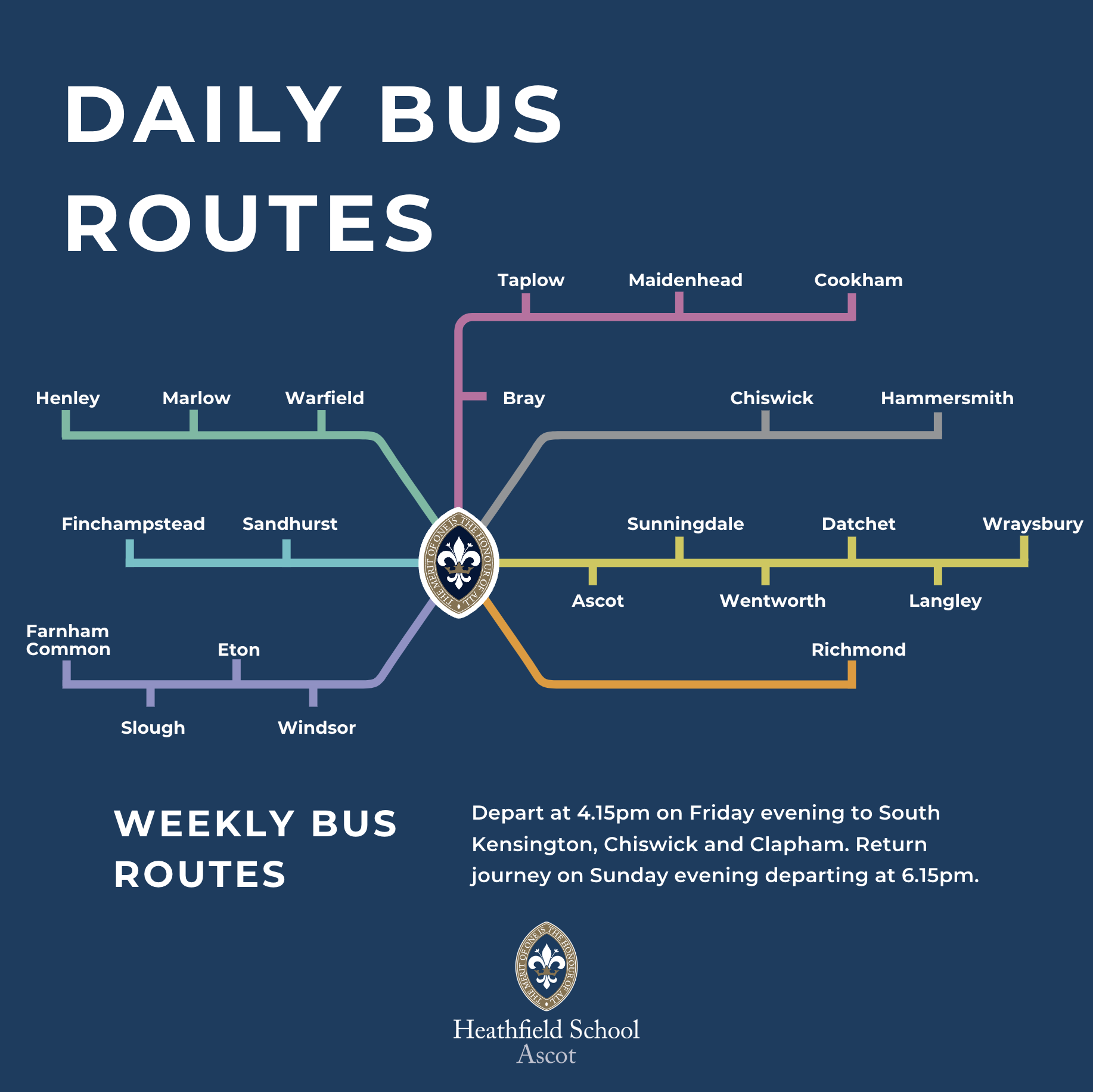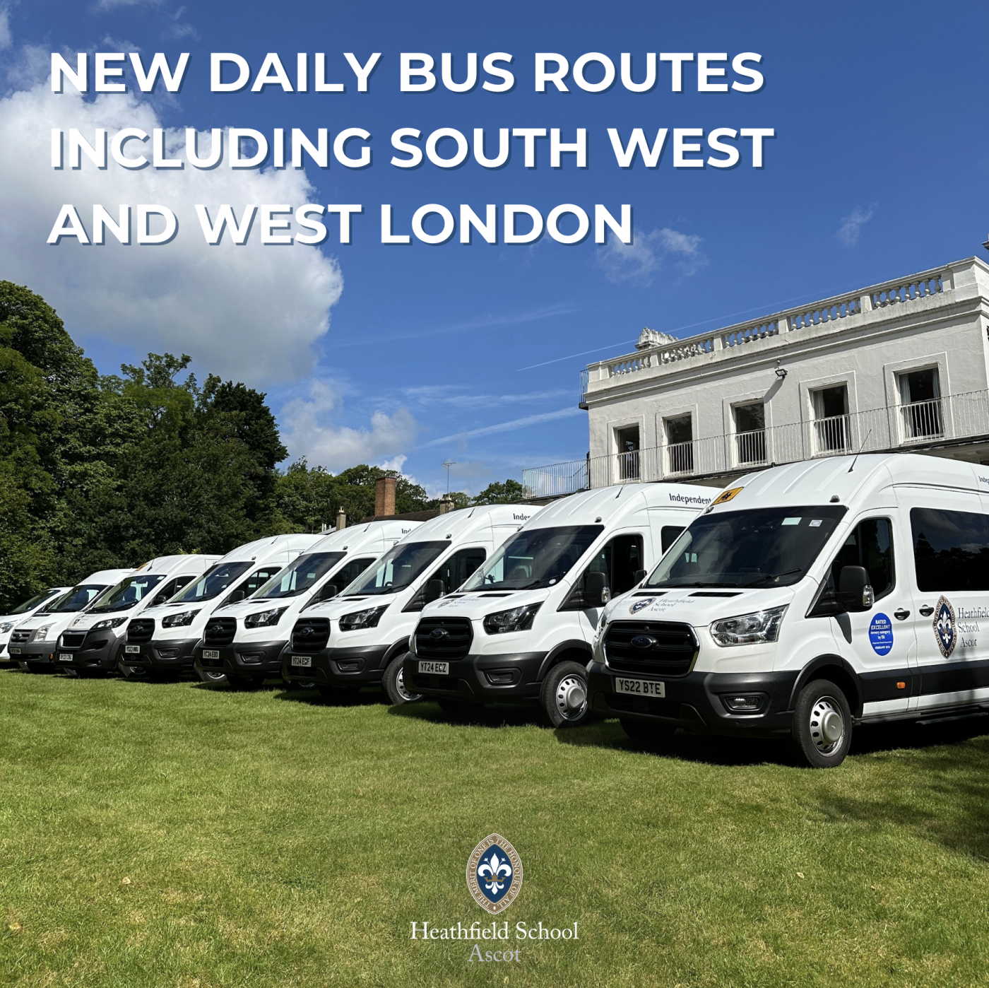 We are excited to be expanding our bus routes from September 2024. We will now be running daily buses to South and West London as well as more local routes to Finchampstead, Henley, Datchet and Wraysbury. For more information on our bus routes, please contact our admissions department – admissions@heathfieldschool.net